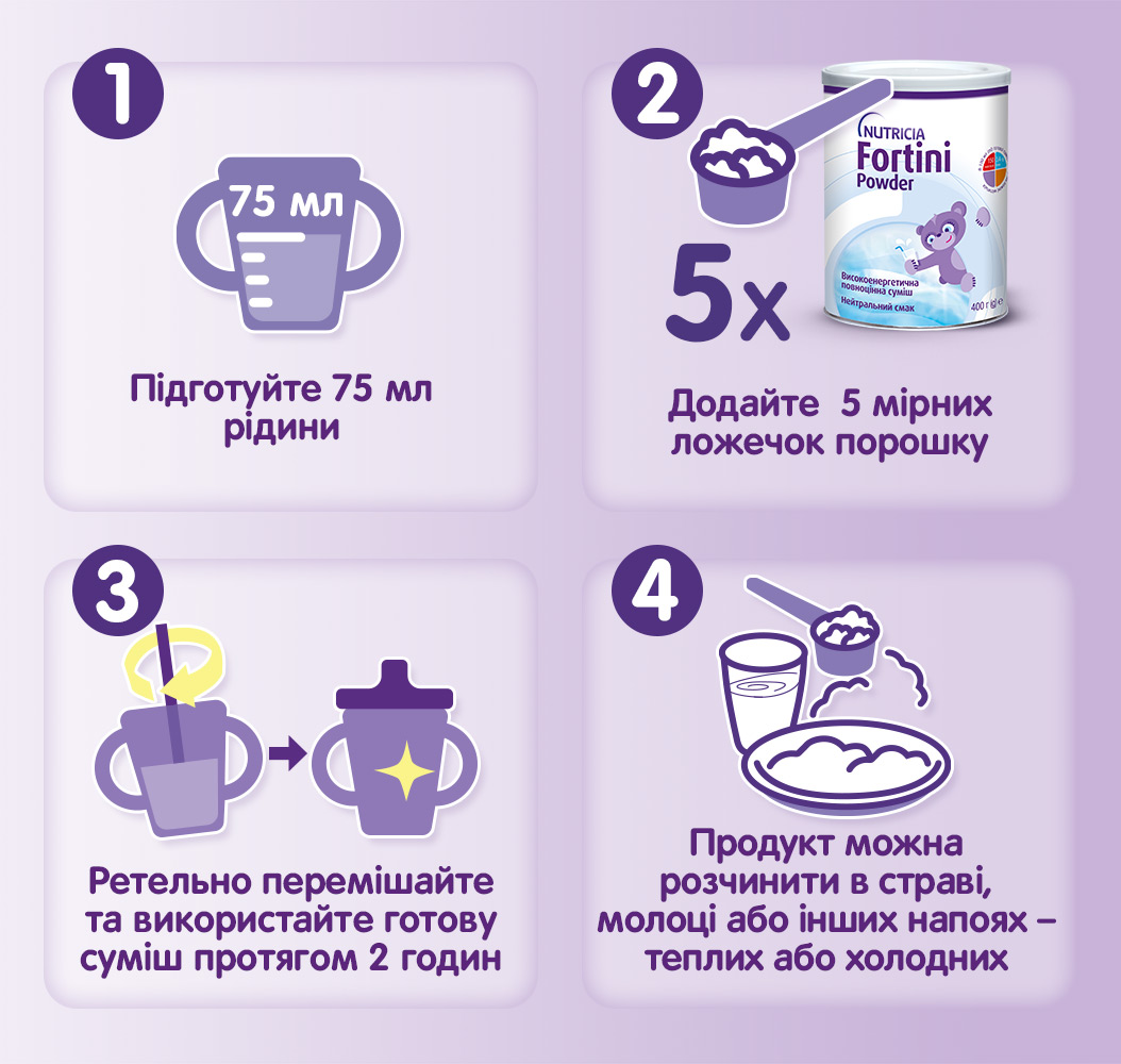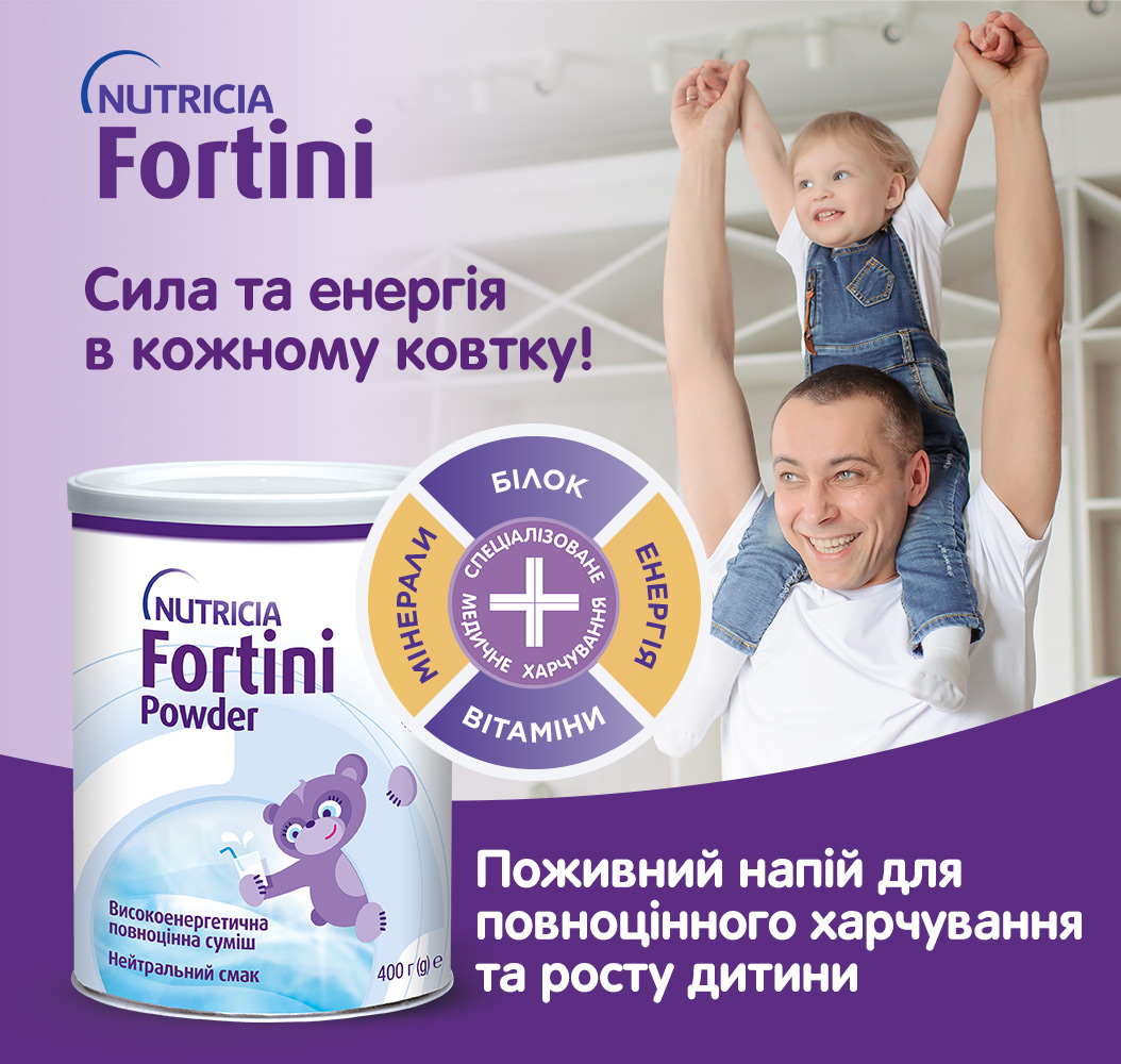 Дитяче ентеральне харчування – харчовий продукт для спеціальних медичних цілей Фортіні Паудер / Fortini Powder з нейтральним смаком для дітей від 1 року та старше.
