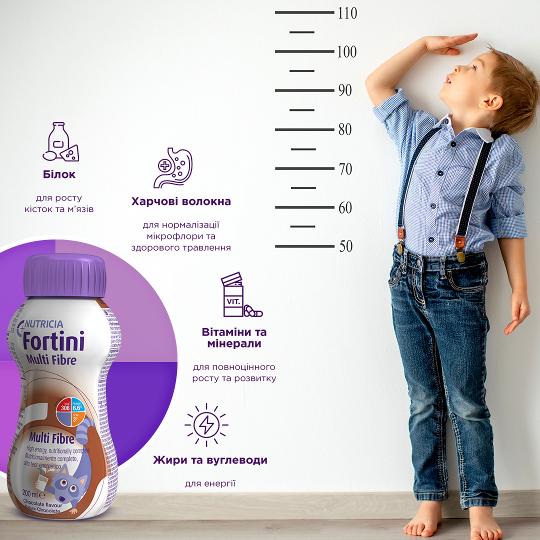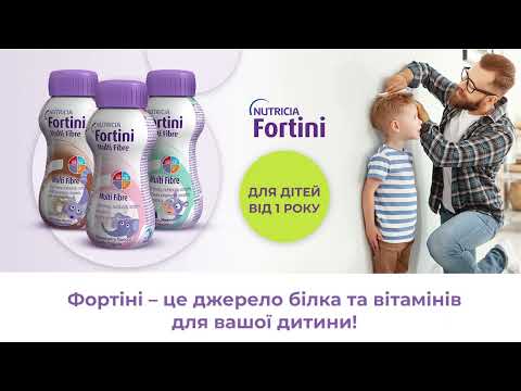 Дитяче ентеральне харчування – харчовий продукт для спеціальних медичних цілей Фортіні / Fortini з харчовими волокнами зі смаком шоколаду. Напій рідкий, готовий до вживання, повноцінний, високоенергетичний, для дітей від 1 року, які не бажають або не здатні споживати достатню кількість звичайних продуктів для задоволення власних харчових потреб.