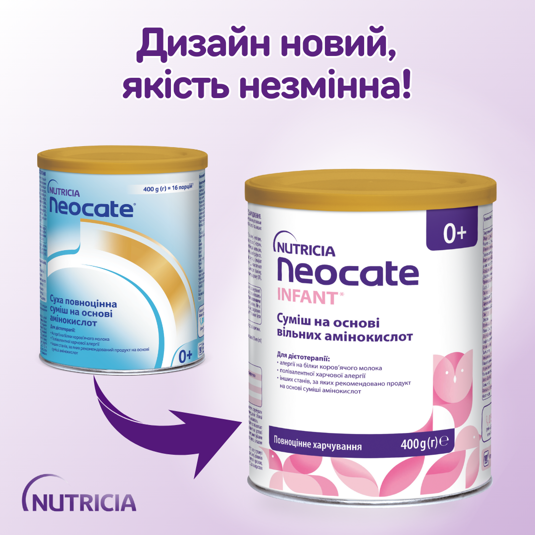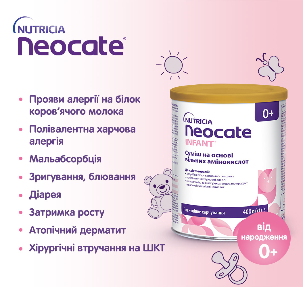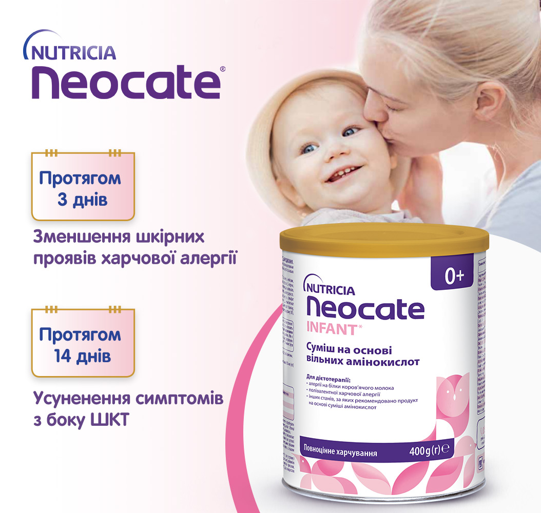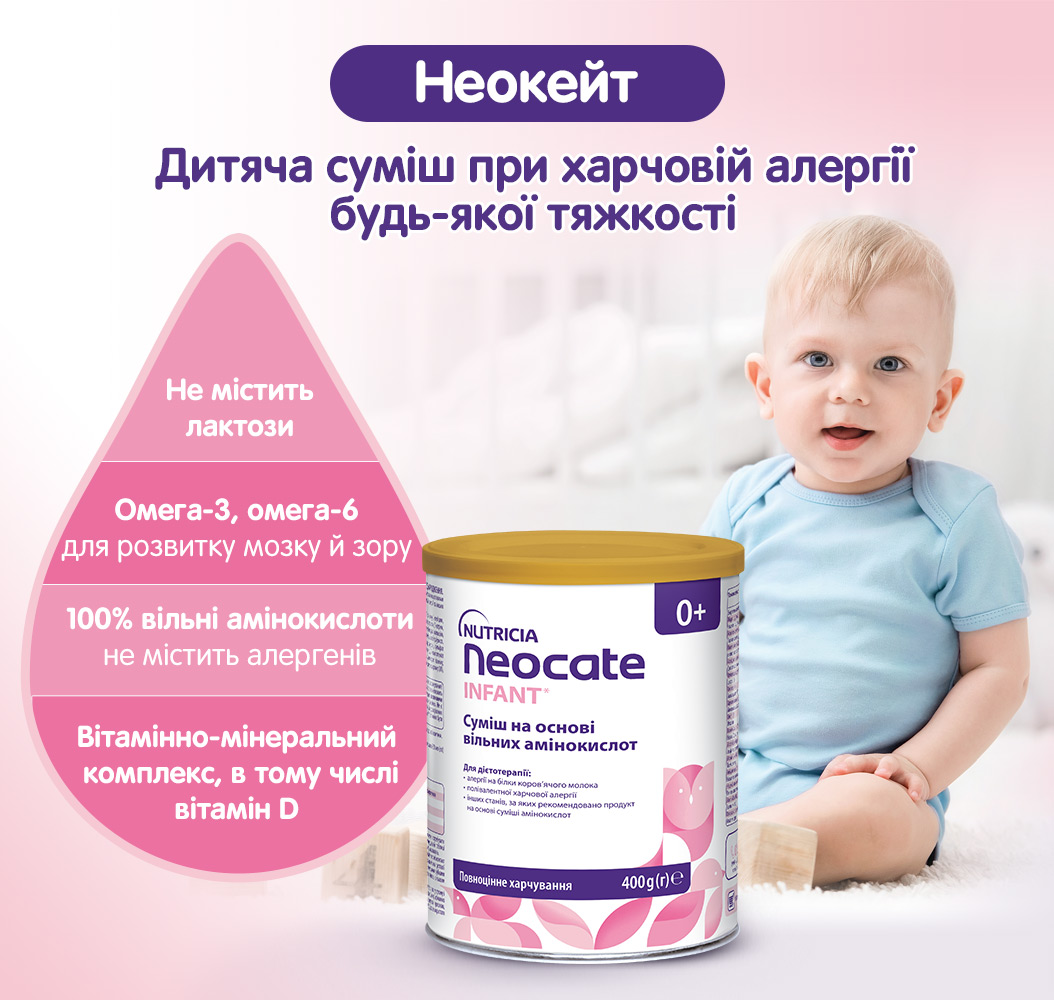 Функціональне дитяче харчування для дітей з харчовою алергією Неокейт Інфант / Neocate Infant від народження. Для дієтотерапії алергії дітей на білки коров’ячого молока, у випадках полівалентної харчової алергії та інших станів, за яких рекомендований продукт на основі суміші амінокислот.