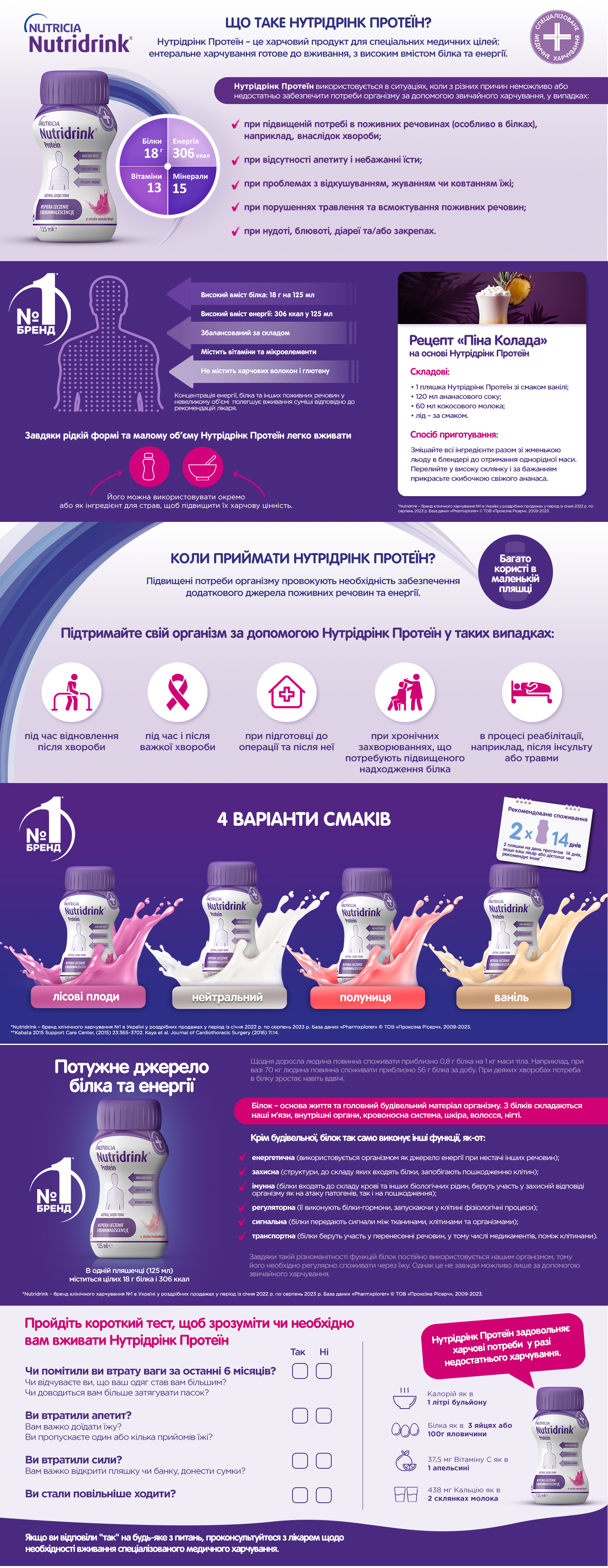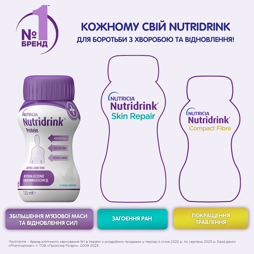 Харчовий продукт для спеціальних медичних цілей: ентеральне харчування Нутрідрінк Протеїн з нейтральним смаком / Nutridrink Protein Neutral flavour - суміш рідка, готова до вживання, з високим вмістом білка та енергії, для дієтичного харчування при мальнутриції (нутритивній недостатності) для пацієнтів від 6 років і старше та дорослих.