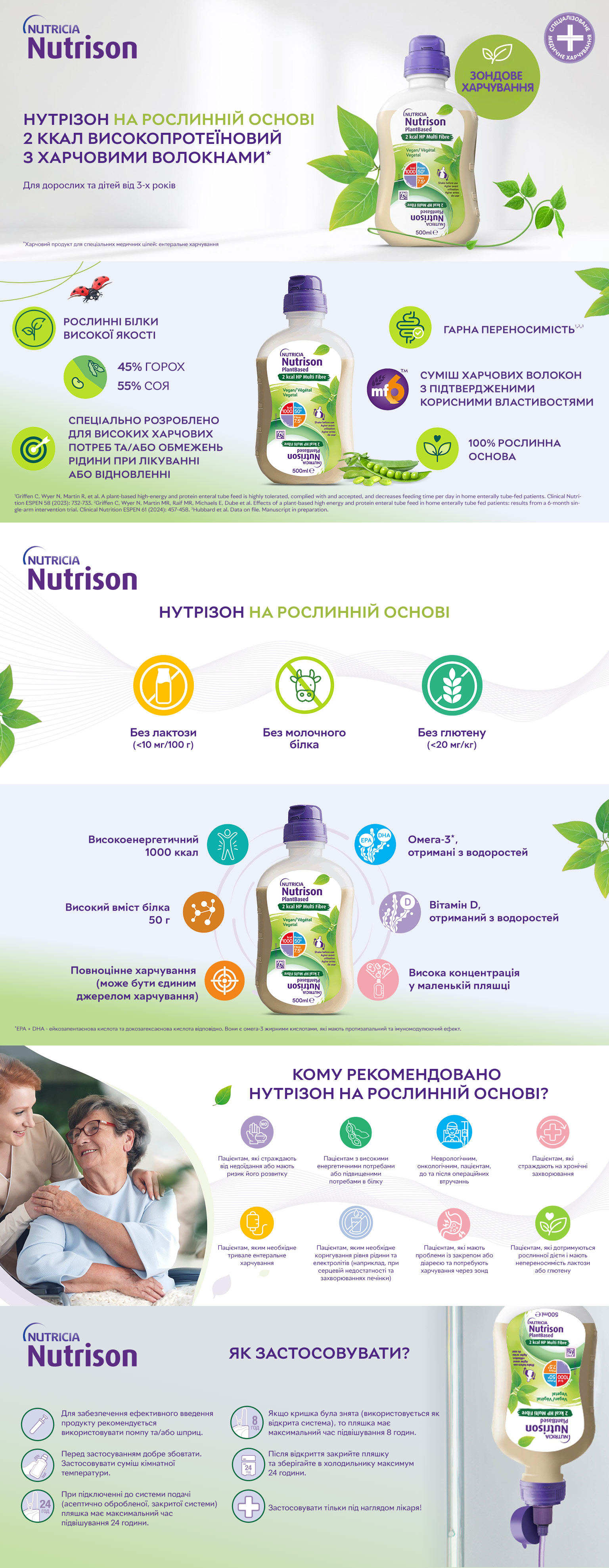 Харчовий продукт для спеціальних медичних цілей: ентеральне харчування Нутрізон на рослинній основі ВП (високопротеїновий) з харчовими волокнами / Nutrison Plant Based 2 kcal HP Multi Fibre – суміш рідка, з високим вмістом білка та енергії, з харчовими волокнами, повноцінна, збалансована, готова до вживання, для годування через зонд.